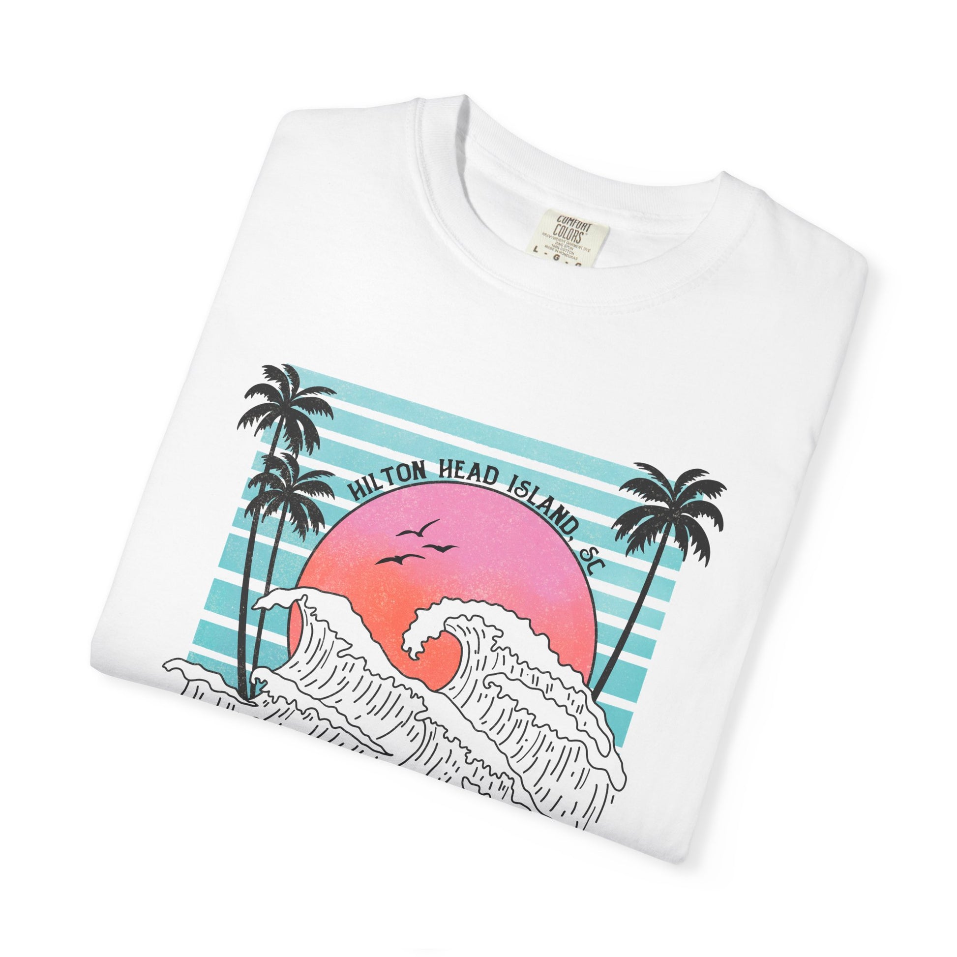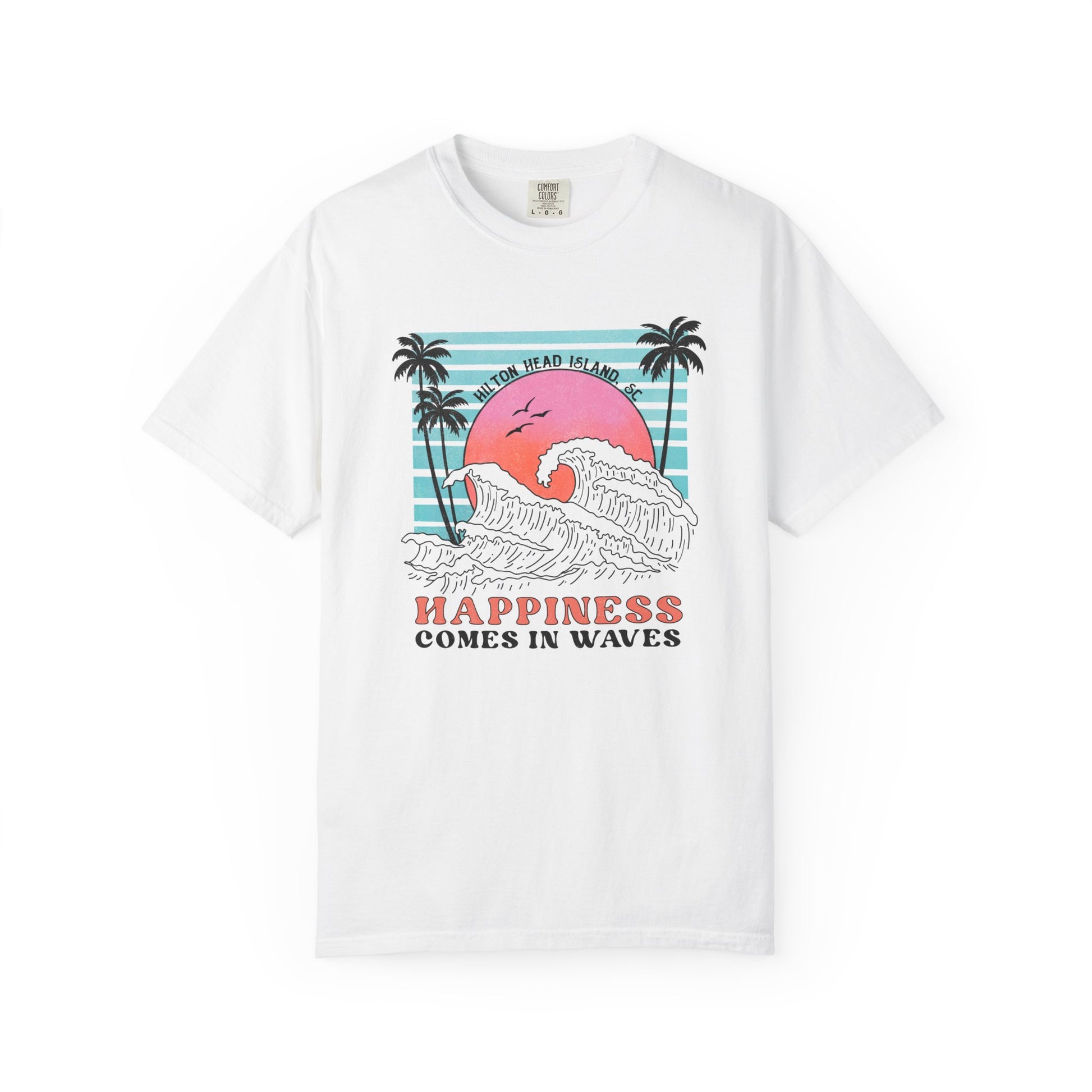 Catch the vibe and ride the wave in this Happiness Comes in Waves tee! It's your new go-to for sun-chasing, island-cruising, and soaking up Hilton Head Islandโ€”one salty breeze at a time.